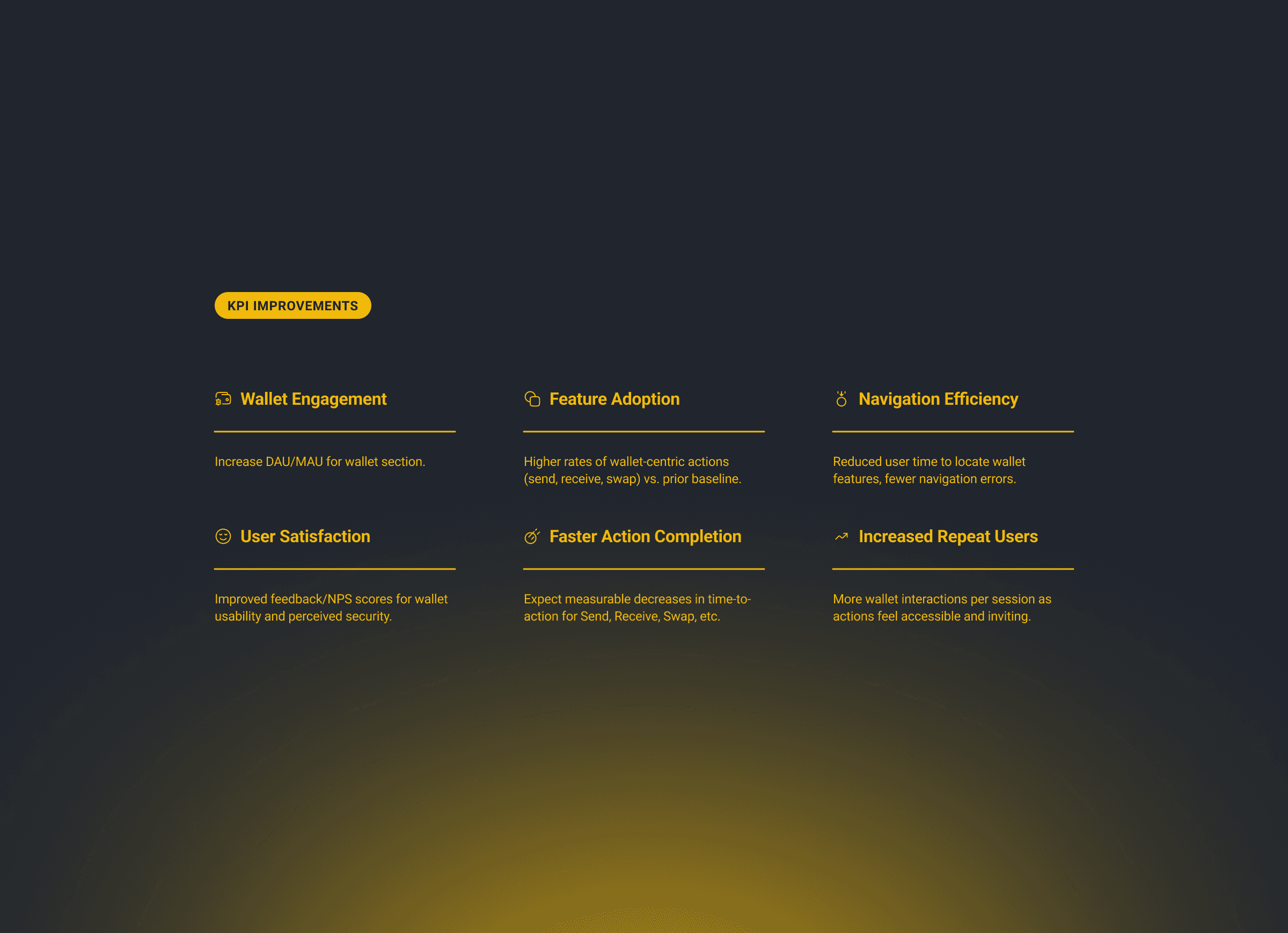 Feature Adoption: Higher rates of wallet-centric actions (send, receive, swap) vs. prior baseline.