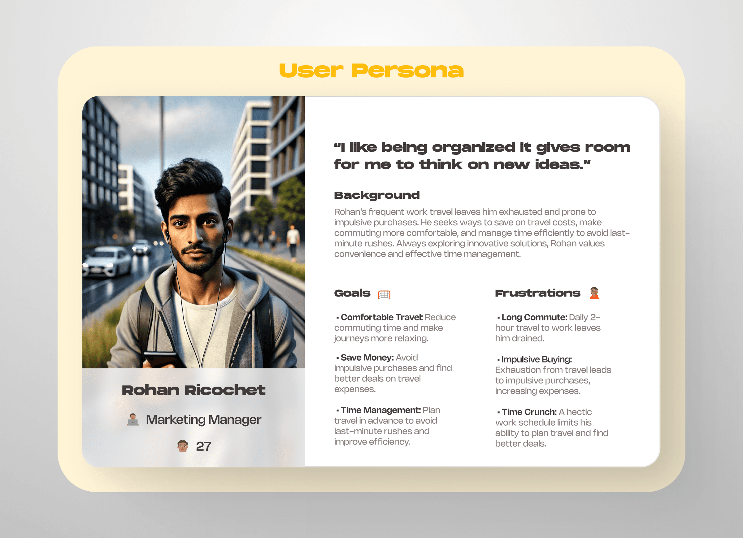 Personas: "Rohan," a busy marketing manager, and "Carry," a tech-savvy software engineer, highlighted the need for simplicity and efficiency.