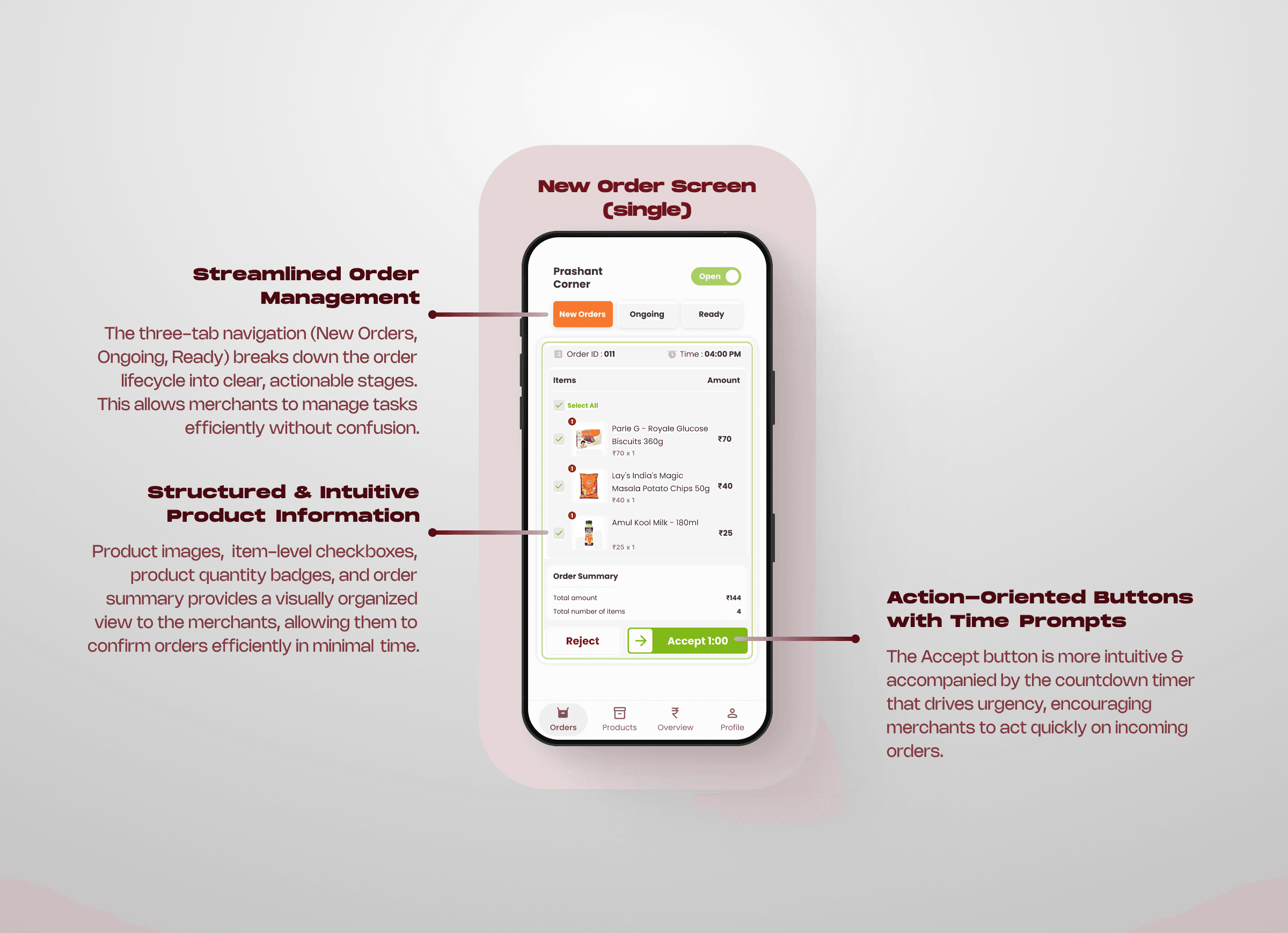 Efficiency: Reduced merchant task completion time by simplifying actions like order acceptance to two taps.