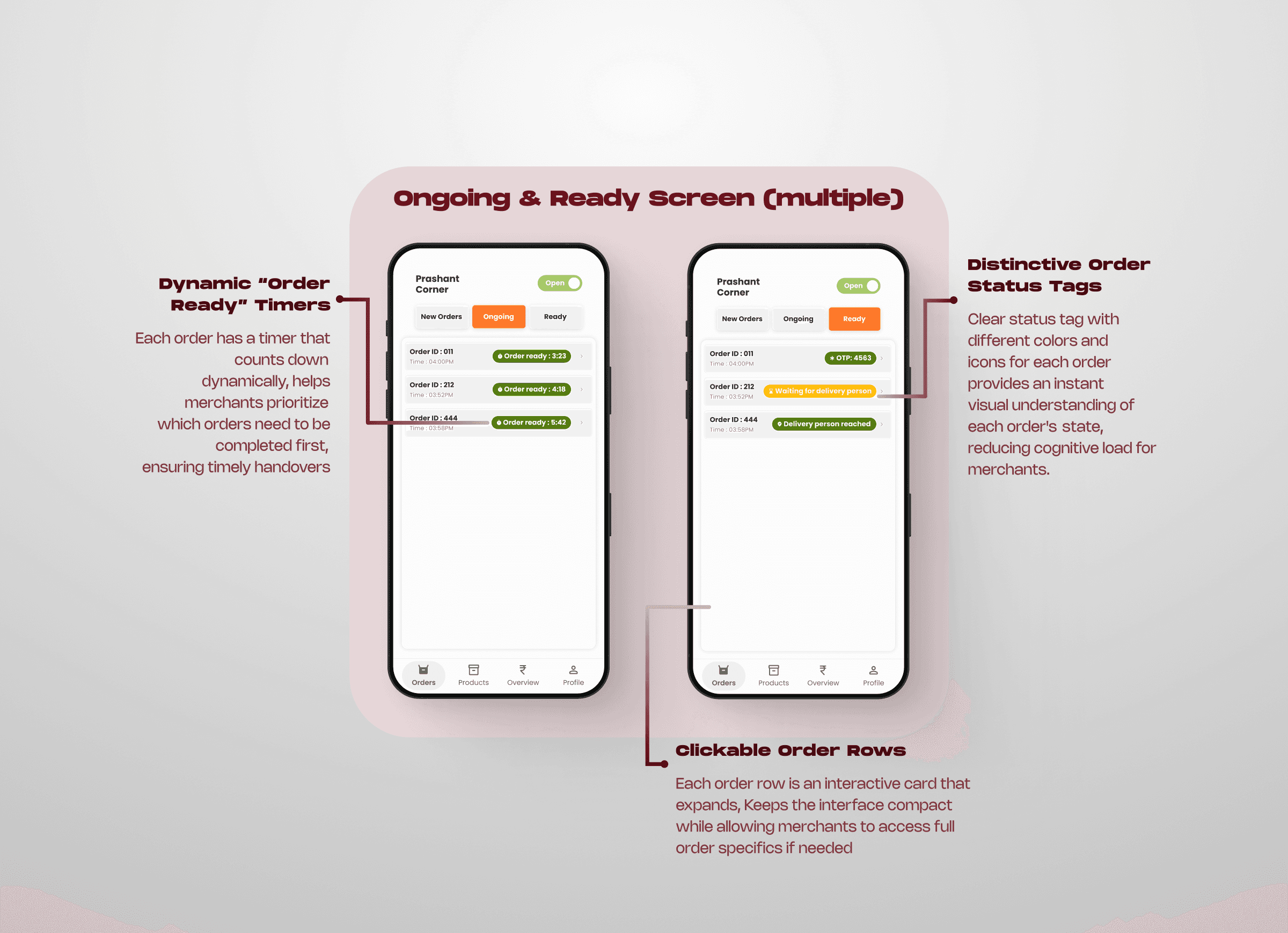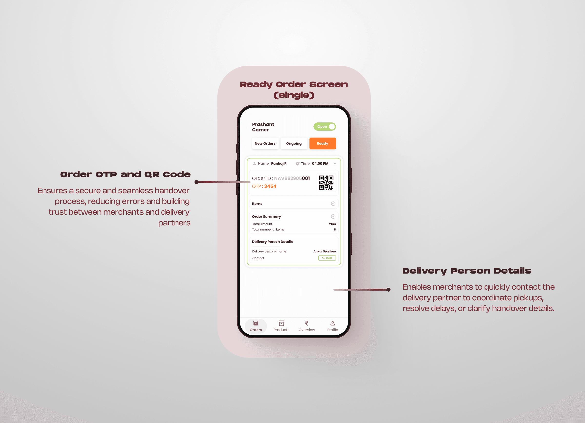 Intuitive UI for merchants to accept orders, track readiness, and hand over items to delivery personnel.