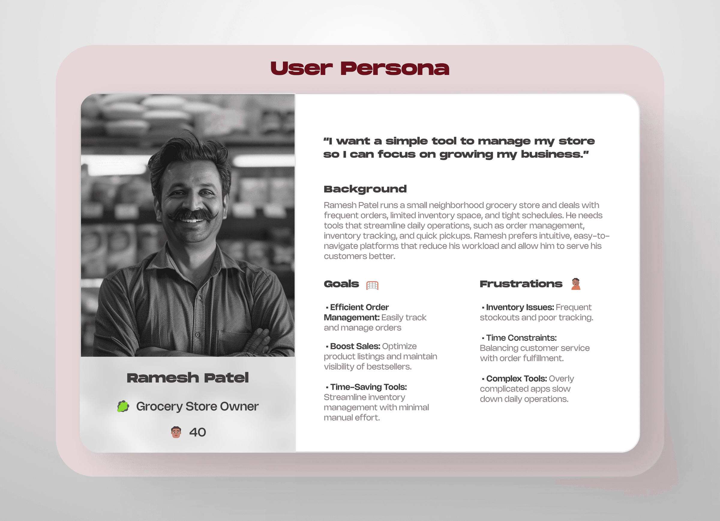 Conducted user interviews with 15 local merchants across diverse categories (groceries, snacks, dairy, etc.) and analyzed competitors like Dunzo, Swiggy Instamart, and BigBasket.